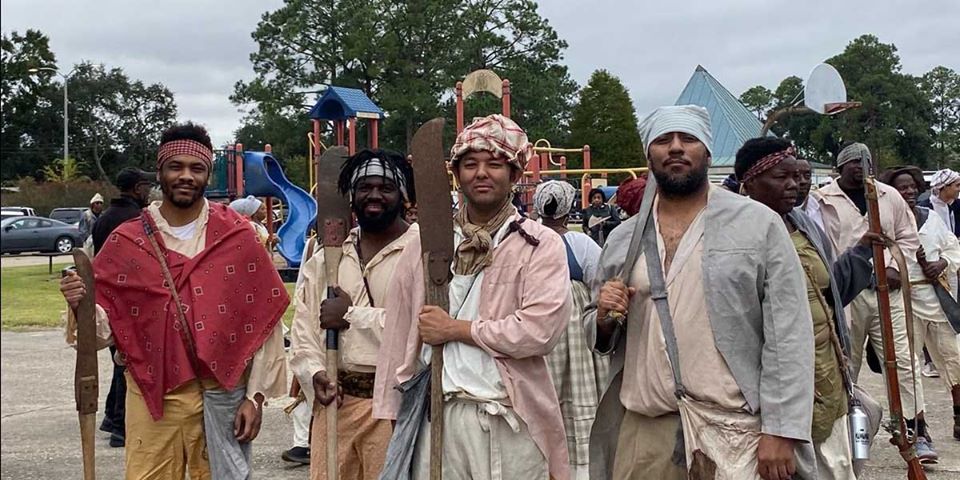 Slave Rebellion Reenactment involved hundreds of people bringing into the present the largest slave revolt in U.S. history, that happened in Louisiana in 1811. Hundreds of Black people carrying machetes and other weapons, marched 26 miles over two days on the route the rebelling slaves marched, now a modern landscape. They chanted “On to New Orleans! Freedom or death! We’re going to end slavery. Join us!” People came out to witness and take part.
