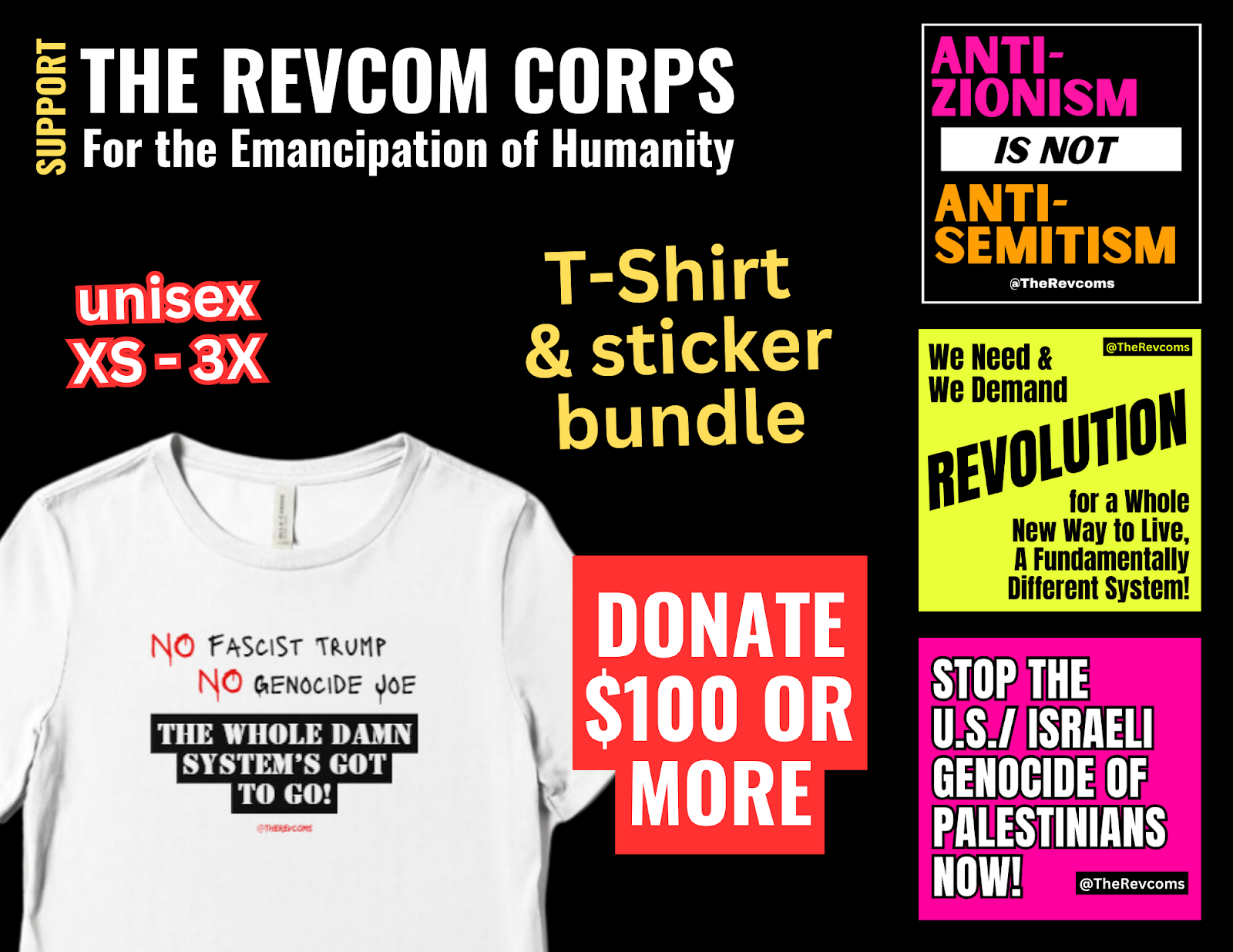 Please do nate whatever you can to support the Revcoms at the Detroit conference, who have come from cities around the country to engage with the thousands of resisters who are gathering there. Your donation of $100 or more will also snag you this limited-edition t-shirt and bundles of stickers. The new t-shirt says “NO Fascist Trump NO Genocide Joe. THE WHOLE DAMN SYSTEM’S GOT TO GO!